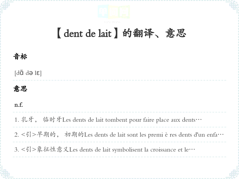 【dent de lait】 助记:、 词根:、 联想、 名词化:、 词化:、 近义词、 反义词、 同音、近音词 联想词