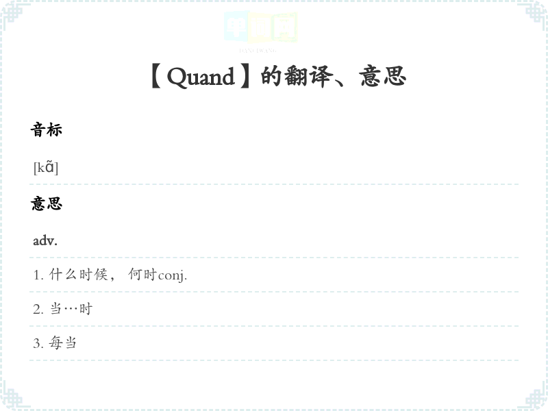 [构成感叹句, 主句省略]:Quand je vous le disais!我不跟您说过吗!瞧, 被我说准了吧!Quand je pense qu'elle aura bientôt seize ans!没想她也快 16岁了!6<旧>同时, 与旧>~(bien)même[连词短语]即使[后接condit. ]~mêmeadv. [短语]