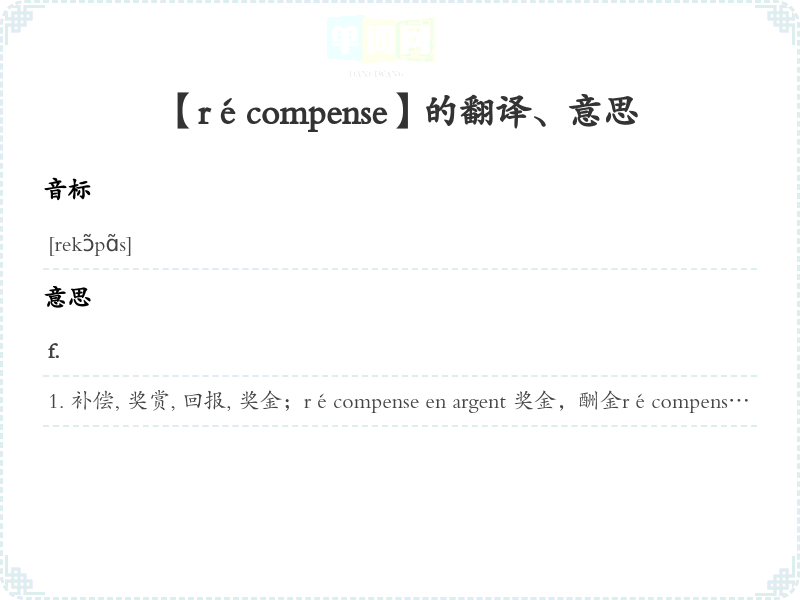 补偿, 奖赏, 回报, 奖金;récompense en argent 奖金,酬金récompense scolaire 学校奖赏,奖品accorder une récompense 批准奖励donner une récompense 给予奖励si vous me faites une commission, vous aurez une récompense 如果您能帮我忙,您将得到报酬<讽>惩罚, 报应讽>mériter une récompense 受到应有惩罚il a désobéi et il a eu la récompense qu'il méritait 他拒不服从而受到应有惩罚