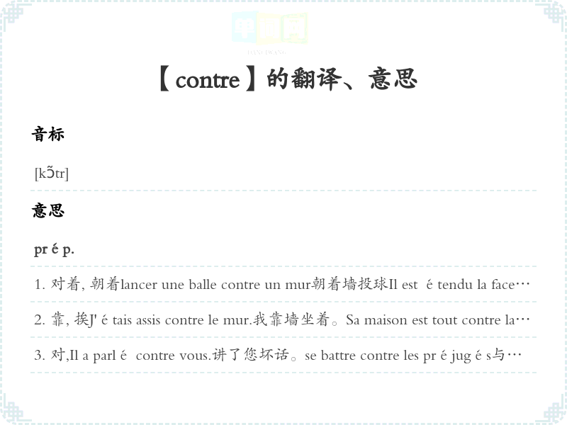紧紧地s'appuyer contre 紧靠着tout contreloc.adv.很近, 紧靠laisser la porte tout contre 让门虚掩着Il loge tout contre .就住在附近。ci-contreloc.adv.对面, 相对, 旁边consulter la page ci-contre 查看旁页là-contreloc.adv.对地Je n'ai rien à dire là-contre .我没有什么对的话要讲。par contreloc.adv.相地, 从另一方面说: Le magasin est assez exigu, par contre il est bien situé.商店相当小, 但是市口很好。n.m.