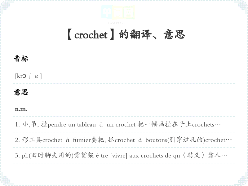 【crochet】 助记:、 词根:、 动词变化:、 名词变化:、 形容词变化:、 近义词:、 反义词: 联想词