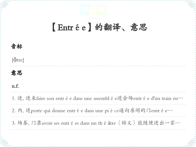 内, 进porte qui donne entrée dans une pièce通向房间的门entrée interdite禁止内entrée libre欢迎光临;欢迎参观entrée gratuite免费场entrée payante买票场solliciter l'entrée dans un parti要求加某政党examen d'entrée 〈引申义〉学考试carte [billet, bon] d'entrée 门票, 场券
