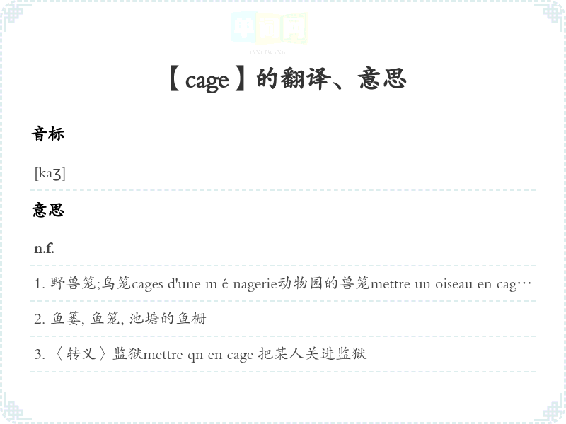 野兽笼;鸟笼cages d'une ménagerie动物园的兽笼mettre un oiseau en cage 把一只鸟关进笼子cages pour des oiseaux de basse-cour家禽笼cage à poules母鸡笼;〈转义〉狭窄的住房cage à lapin兔笼La belle cage ne nourrit pas l'oiseau.〈谚语〉华美的笼子喂不鸟儿。住好不等于。