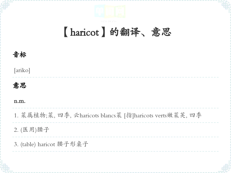 〈口语〉Des haricot s!你将一无所得!你什么也得到!C'est la fin des haricots.〈口语〉一切都完了。n.m.haricot de mouton 土萝卜炖羊肉