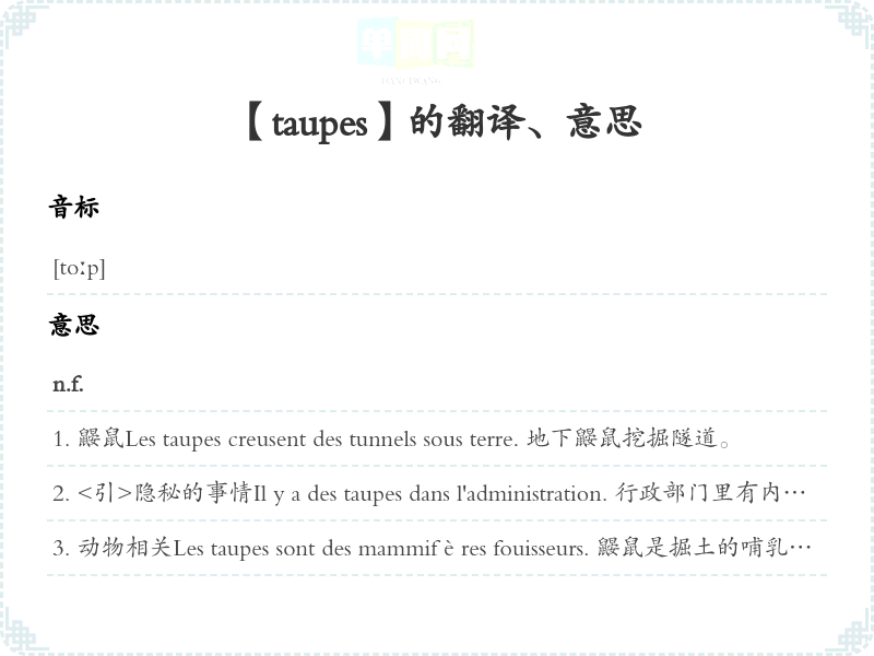 【taupes】 助记:、 词根:、 联想、 名词化:、 词化:、 形容词化:、 近义词、 反义词、 同音、近音词 联想词