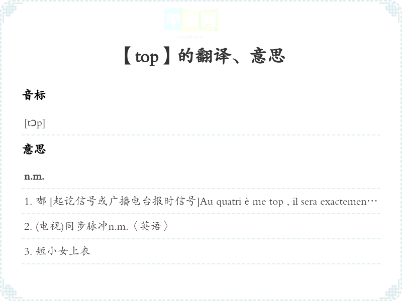 首位;最佳东西, 最重要事物top niveau最高水平top secret绝top model头号模特;超级名模