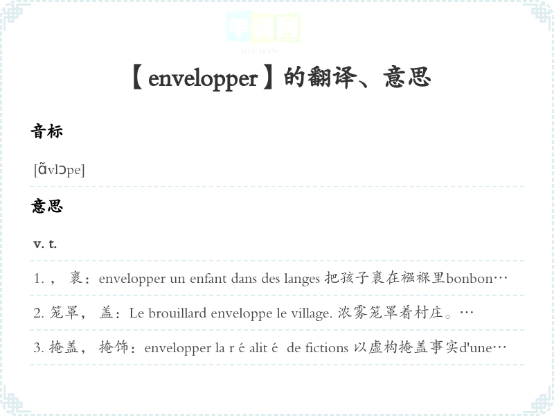 【envelopper】 助记:、 词根:、 派生:、 近义词:、 反义词: 联想词