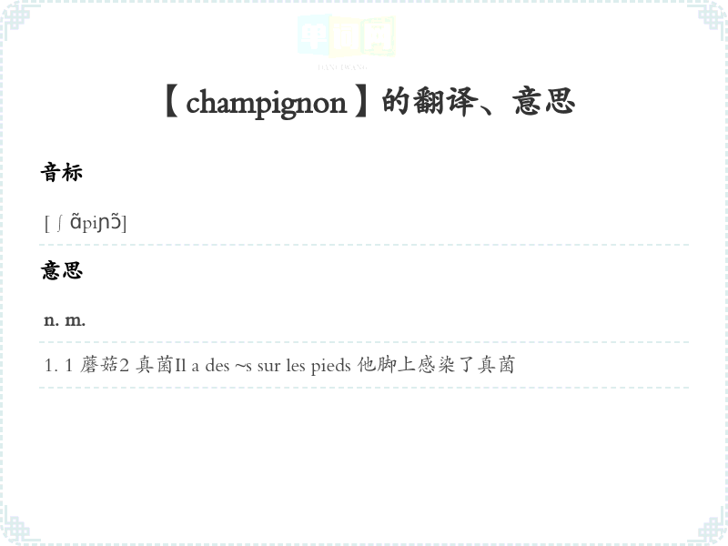 1 蘑菇2 真菌Il a des ~s sur les pieds 他脚上感染了真菌