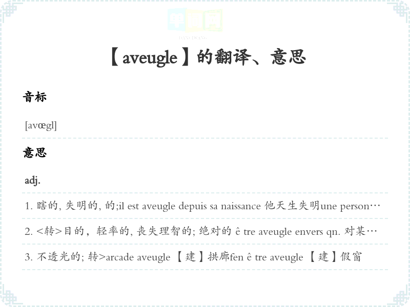 【aveugle】 形容词变化:、 名词变化:、 副词变化:、 近义词:、 反义词: 联想词