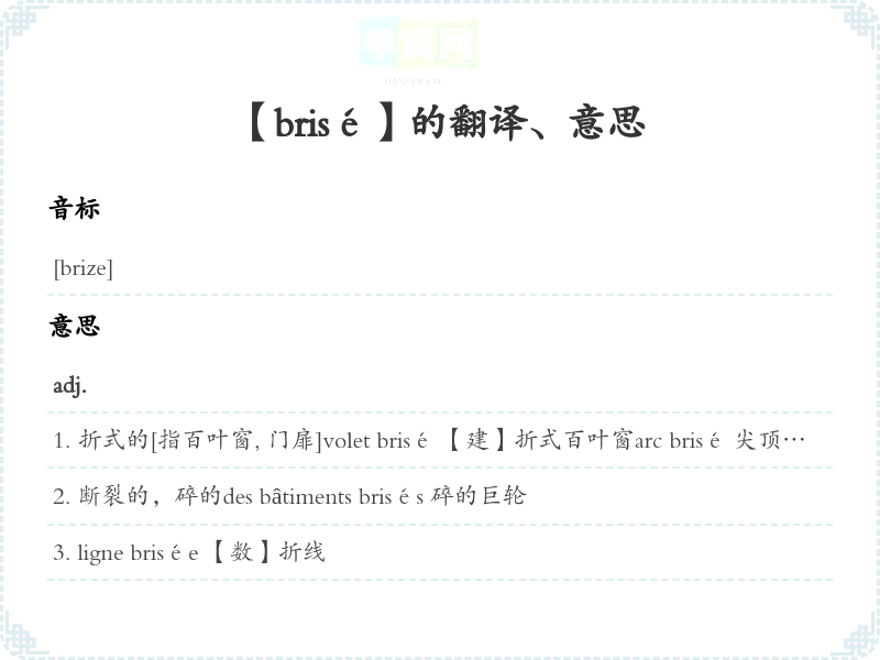 折式的[指百叶窗, 门扉]volet brisé 【建】折式百叶窗arc brisé 尖顶拱comble brisé 复折屋顶