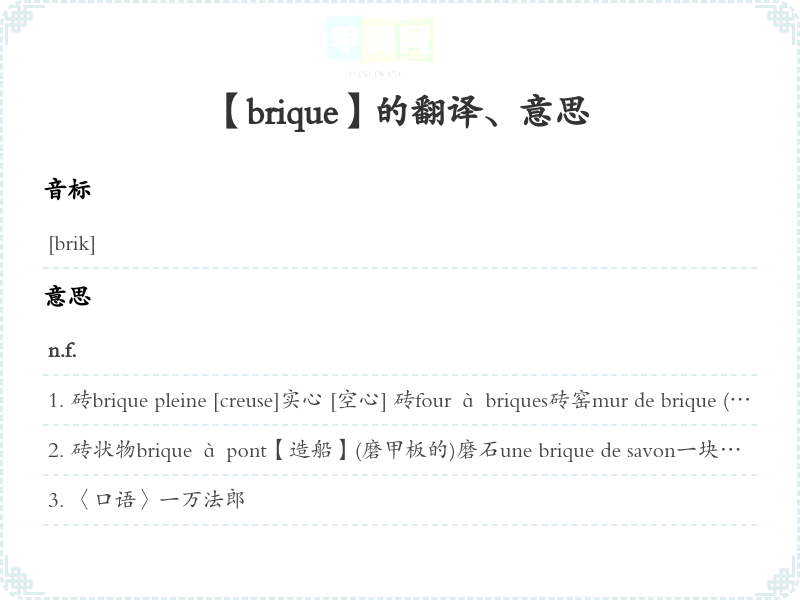 【brique】 词源:、 派生:、 近义词、 同音、近音词 联想词