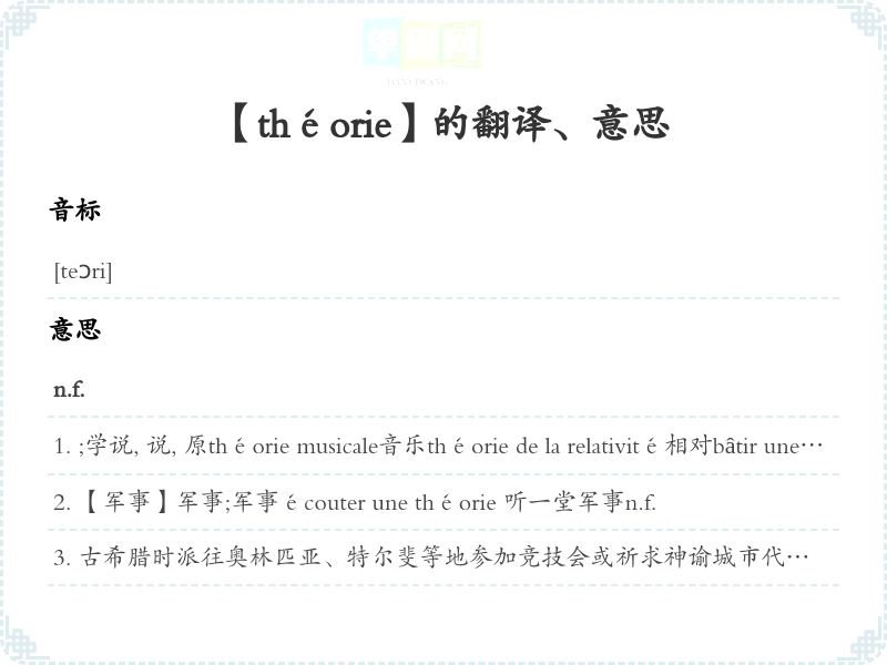 【théorie】 派生:、 近义词:、 反义词: 联想词