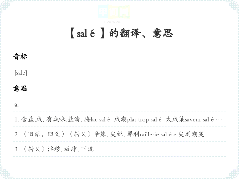 含盐;咸, 有咸味;盐渍, 腌lac salé 咸湖plat trop salé 太咸菜saveur salée 咸味porc salé 腌猪肉, 咸肉l'onde salée 〈诗歌用语〉大avoir le bec salé〈语〉渴
