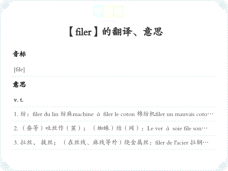 尾随, 跟踪, 钉梢:filer un suspect 尾随一个可疑的人filer un son 拖长一个音filer un scène 使有次层地发展