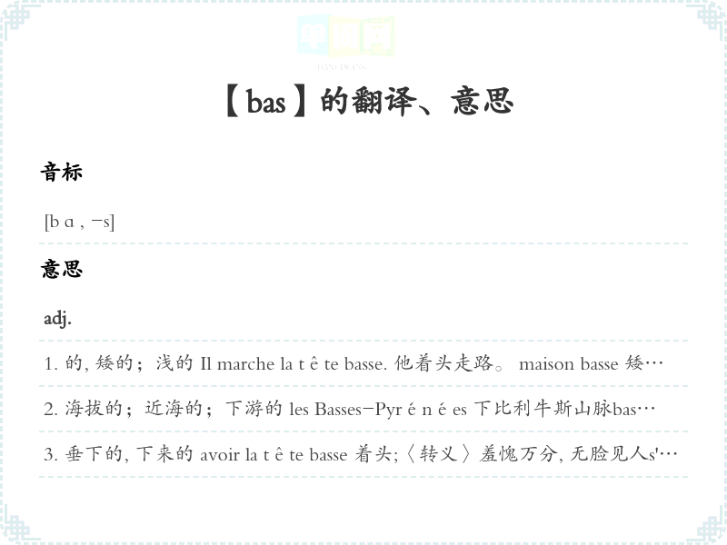下面的, 下部的, 下方的bas étage 下面的一层les branches basses d'un arbre一棵树的下部树枝soleil bas 夕阳Les nuages sont bas. 云层。Le temps [Le ciel] est bas. 天云暗。ce [le] bas monde 人间, 尘世n.m.下部, 下端, 底部, 末端le bas du visage 脸的下部le bas d'une montagne 山脚, 山麓recoudre le bas du pantalon 重新缝裤脚的边le bas d'une gamme de produits [un produit bas de gamme](一个系列中的)档次产品des hauts et des bas 伏bas de casse【印刷】字盘底部;小写字母铅字n.m.