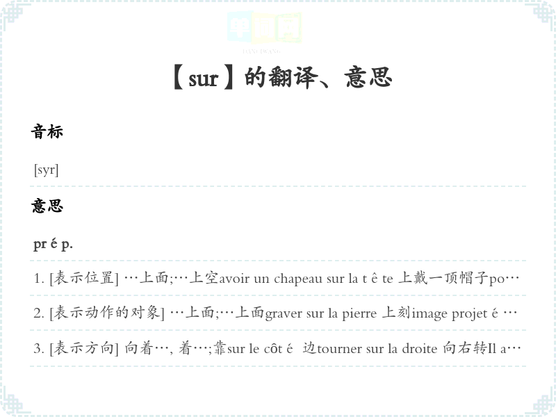 [表示方向] 向着…, 着…;靠sur le côté 边tourner sur la droite 向右转Il a deux fenêtres sur la rue. 他的房子有两扇街的窗。marcher sur les pas de qn 跟着某人的脚步走revenir sur Paris 回巴黎fermer la porte sur soi 随手关门Elle allait sur ses vingt ans.〈比喻〉她快20岁了。ville sur le Yangtsé 长江边上的城市