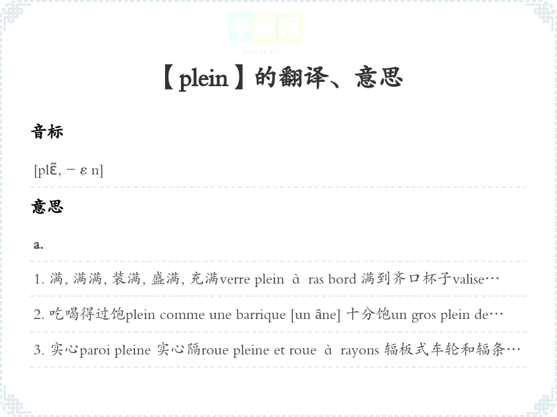 装满, 盛满avoir de l'argent plein les poches 口袋里满满是钱avoir du poil plein les joues〈口语〉满脸都是胡子en avoir plein la bouche〈转义〉把这个经常挂在嘴上en avoir plein les bottes〈口语〉走得太累了en avoir plein le dos〈口语〉对此已感到厌烦en mettre plein la vue à qn〈口语〉给某人强烈感受, 诱惑某人plein deloc.prép.许多, 很多Il y a plein de monde dans la rue. 街上全是人。adv.sonner plein (实心物体被叩击时)发出实声 / tout plein 〈口语〉非常, 很Vous êtes gentil tout plein. 您实在太好了。n.m.