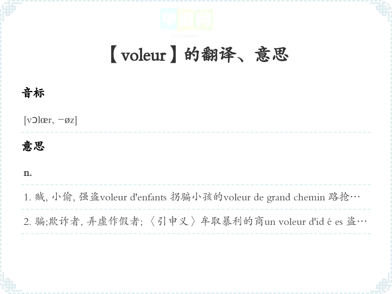 骗;欺诈者, 弄虚作假者; 〈引申义〉牟取暴利的商un voleur d'idées 盗用他想法的n.m.猎鹰a.爱偷东西的, 手脚不干净的;获取暴利的un commerçant voleur 奸商,获取暴利的商être voleur comme une pie 偷窃成性