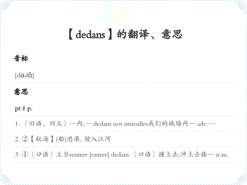 〈旧语,旧义〉…内, …dedans nos murailles我们的城墙内— adv.内,Avez-vous mis le chèque dans l'enveloppe?—Oui, il est dedans . 您把支票放信封了吗? —是的, 放了。Vous attendrai-je dehors ou dedans ?我外还是等您?mettre [foutre] dedans 投入监狱;关禁闭mettre [ficher] qn dedans 〈口语〉使某人上当donner dedans