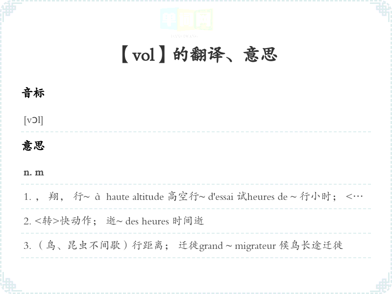 , 翔, 行~ à haute altitude 高空行~ d'essai 试heures de ~ 行小时; <转>专业经验au ~ 在行中; 凌空, 在空中; 快地en (plein) ~ 在行中de haut ~ 能高; <转>到很高程度, 手段高明prendre son ~ 起来, 起; <转>跃发展转>转>转>