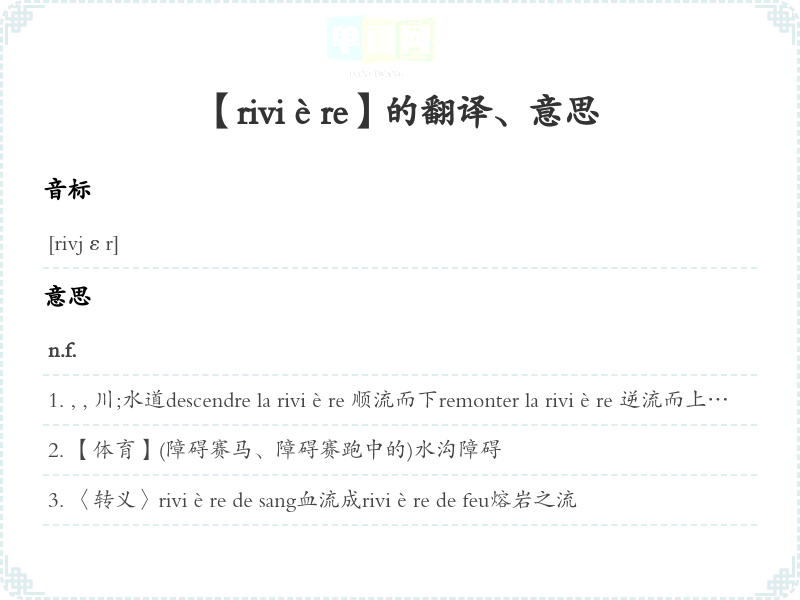 , , 川;水道descendre la rivière 顺流而下remonter la rivière 逆流而上traverser la rivière 过pêcher dans la rivière 在里捕鱼ne pas trouver de l'eau à la rivière 〈转义〉〈口语〉在里找不到水 [喻笨拙得连极易找到的东西也找不到]Les petits ruisseaux font les grandes rivières.〈谚语〉积水成渠。聚沙成塔。集腋成裘。