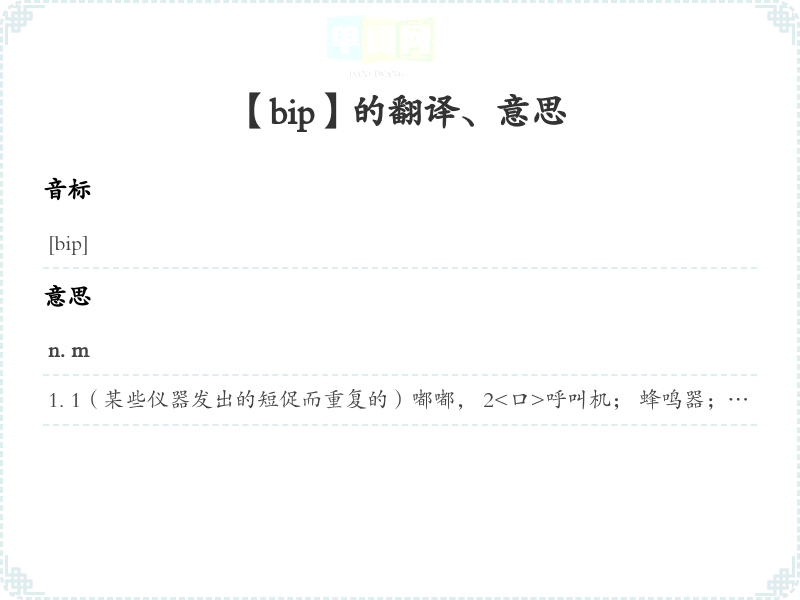 1(某些仪器发出的短促而重复的)嘟嘟, 2<口>呼叫机; 蜂鸣器; 寻呼机[亦bip-bip]口>