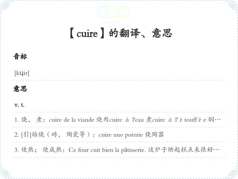 烧, 煮:cuire de la viande 烧肉cuire à l'eau 煮cuire à l'étouffée 焖cuire à l'étuvée 蒸cuire à sec 烤, 烘fruits à cuire 熟吃水果