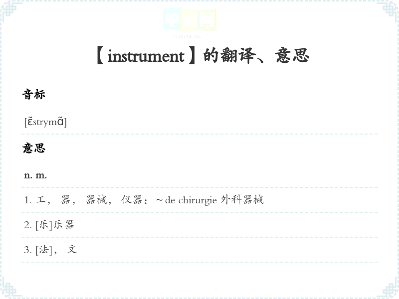 工, 器, 器械, 仪器:~de chirurgie 外科器械