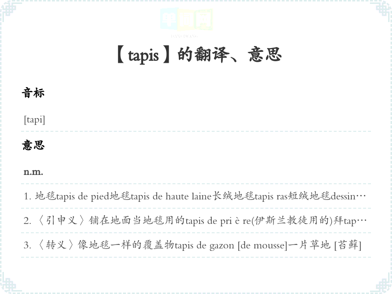 【tapis】 联想:、 动词变化:、 名词变化:、 近义词: 联想词