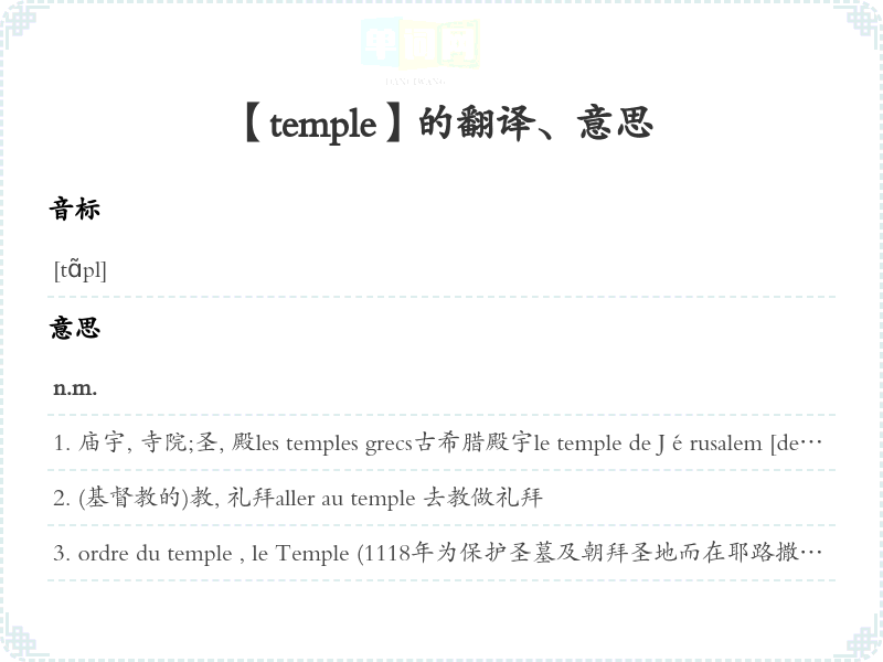 庙宇, 寺院;圣, 殿les temples grecs古希腊殿宇le temple de Jérusalem [de Salomon], le Temple (古代犹太人在3个不同时期建立的)耶路撒冷古圣殿
