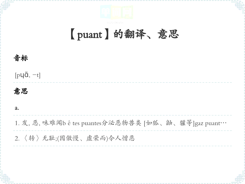 发, 恶, 味难闻bêtes puantes分泌恶物兽类 [如狐、鼬、貛等]gaz puant 【化学】 [特指硫化氢]