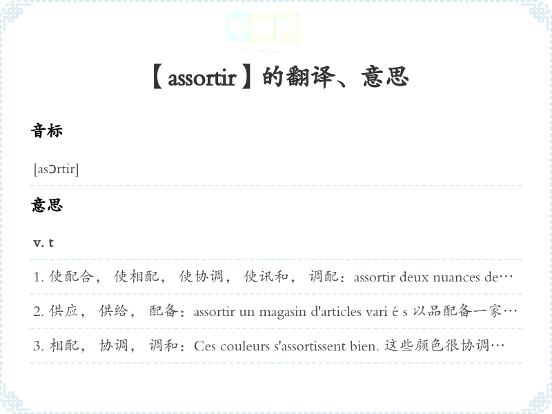 使配合, 使相配, 使协调, 使讯和, 调配:assortir deux nuances de laine à tricoter pour faire un chandail 用两颜色相近毛线配结在一件套衫assortir une chose à d'autres 使一东西方和其它东西相配assortir des convives 搭配宴会宾客, 安排宾客席位