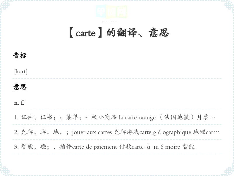 证件,证书;;菜单;一板小商品 la carte orange (法国地铁)月票carte de membre d'un club 俱乐部会员证carte d'invitation 请帖,请柬carte de visite 名