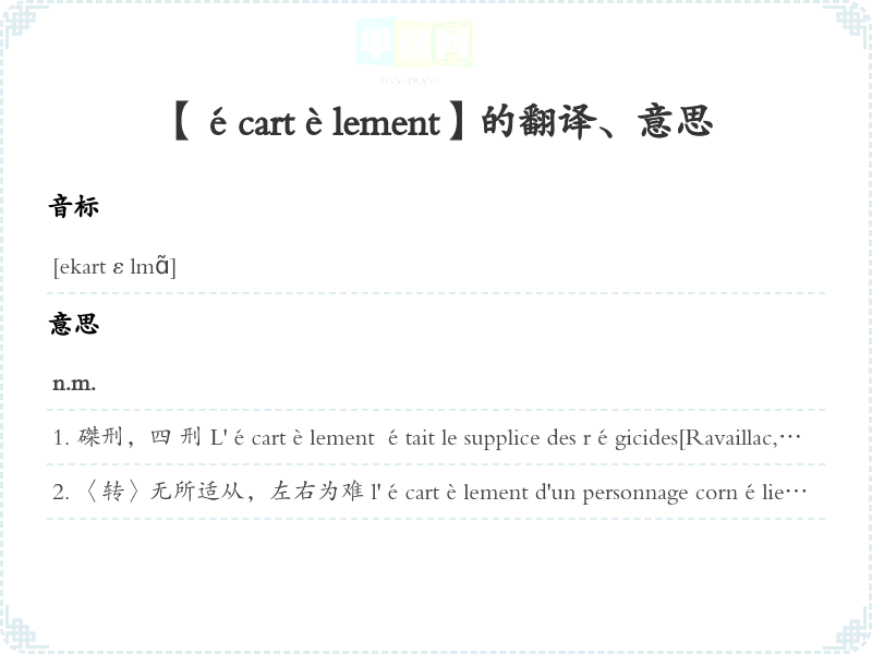 〈转〉无所适从,左右为难 l'écartèlement d'un personnage cornélien entre le devoir et la passion在责和爱情之间左右为难高乃人物Il souffrait de ce pénible écartèlement entre son devoir et son affection.他为自己在责和爱情之间无所适从而经受着痛苦折磨。