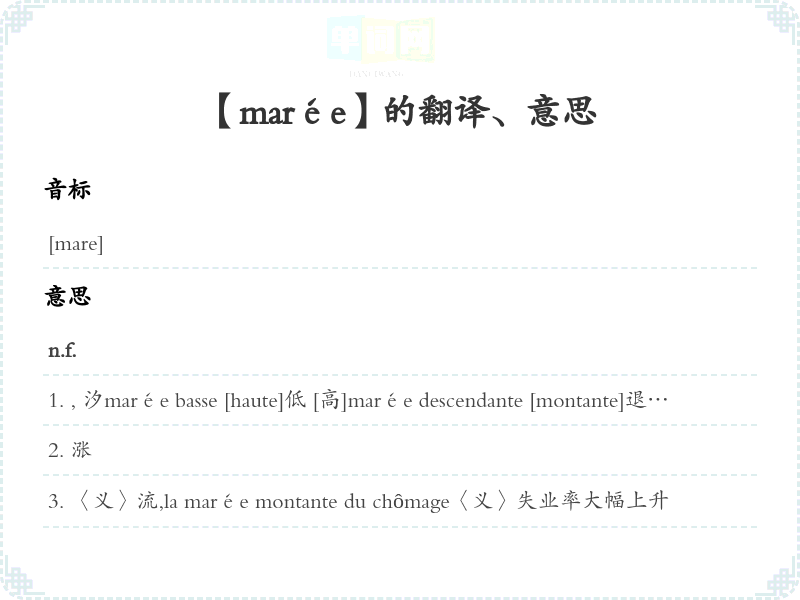 , 汐marée basse [haute]低 [高]marée descendante [montante]退 [涨]marée de morte-eau, faible marée 小marée de vive-eau, grande marée 大marée humaine〈义〉水般人群, 人amplitude de la marée 差bassin de marée 水船渠changement [renversement] de maréecoefficient de marée 差比率, 差系数échelle de marée 汐杆, 验器raz de marée 海啸La marée change. La marée est étale.了。La marée descend [perd].退了。La marée monte.涨了。contre vents et marées〈义〉不畏任何险