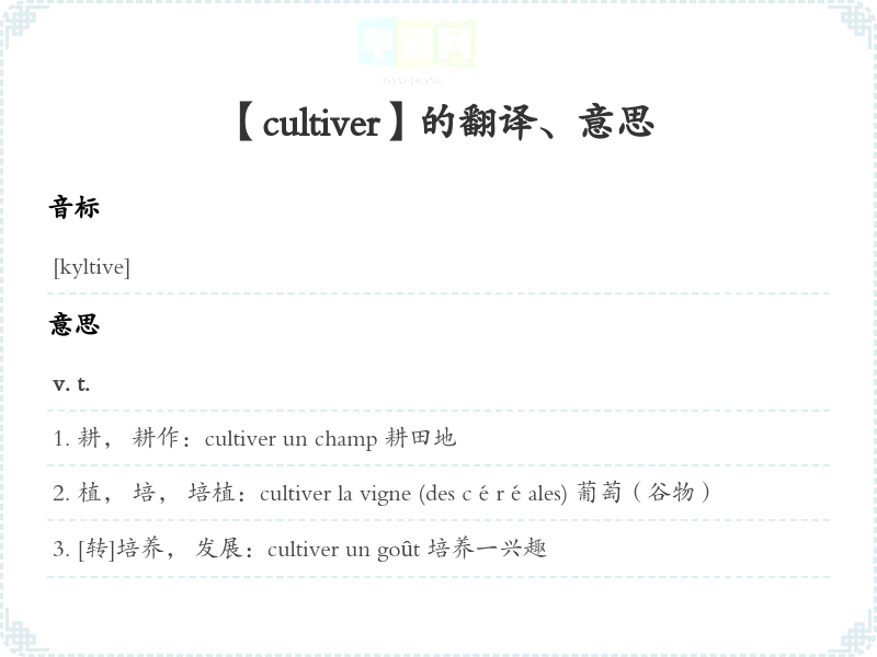 【cultiver】 助记:、 词根:、 派:、 形容词变化:、 近义词:、 反义词: 联想词