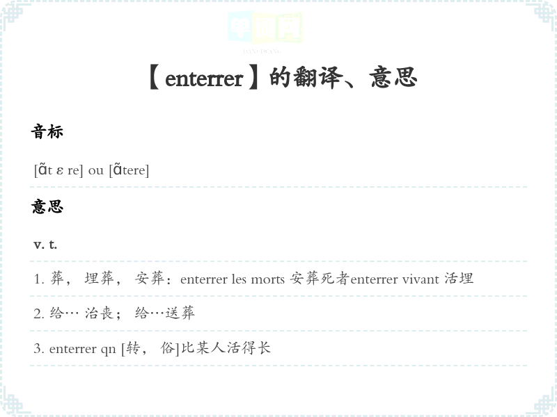 [转]葬送; 摈弃, 放弃; 了结:charlatan qui enterre ses maladies 断送病人性命的庸医enterrer un projet 放弃一项计划enterrer une affaire sans bruit 暗中了结一件事