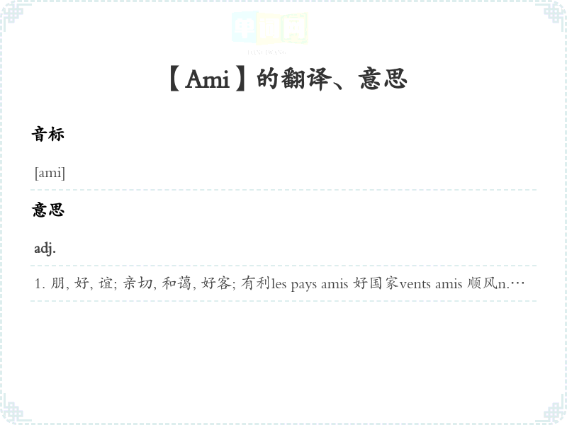 【Ami】 派生:、 名词变化:、 形容词变化:、 近义词:、 反义词: 联想词