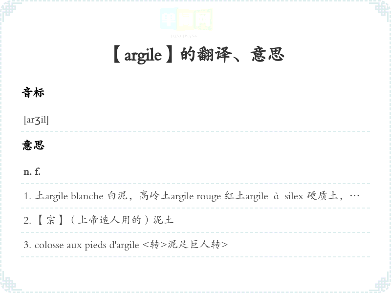 土argile blanche 白泥,高岭土argile rouge 红土argile à silex 硬质土,燧石胶土argile réfractaire 土