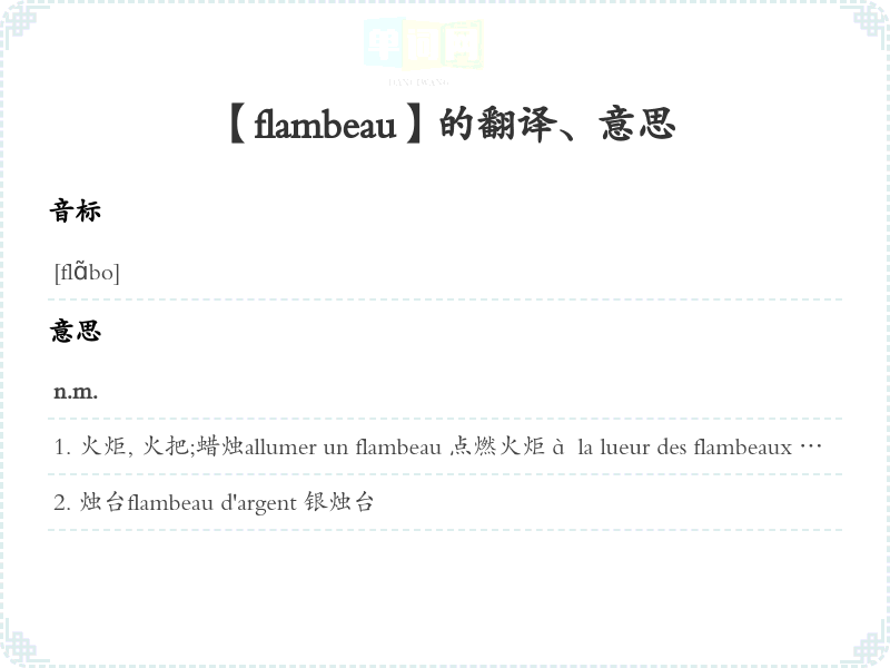 火炬, 火把;蜡烛allumer un flambeau 点燃火炬à la lueur des flambeaux 在火把亮光下retraite aux flambeaux (集会后)火炬游行passer [se transmettre] le flambeau à qn 将接力棒传给某人le flambeau de la liberté〈书面语〉自由火炬le flambeau de la science〈书面语〉科学之光le flambeau du jour [du monde]〈诗歌用语〉太阳le flambeau de la nuit〈诗歌用语〉月亮les flambeaux de la nuit, les célestes flambeaux〈诗歌用语〉星辰