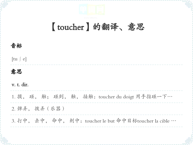 摸, 碰, 触; 碰到, 触, 接触:toucher du doigt 用手指碰一下toucher délicatement des fruits pour juger de leur maturité 轻轻地摸果子看看是否熟了toucher la main à qn 和某人握手toucher le porte (船舶)进港靠岸toucher le sol (飞机)着陆toucher le sol des deux épaules (摔角选手)两肩触地ne pas toucher terre 脚不着地[喻]