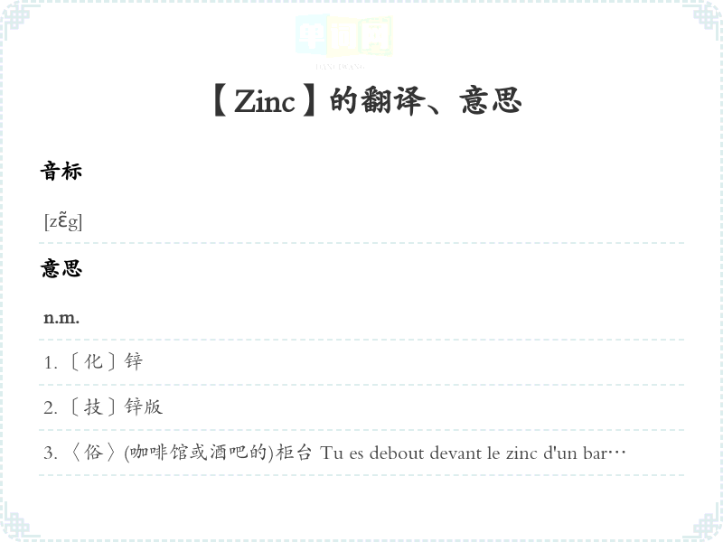 〈俗〉(咖啡馆或酒吧的)柜台 Tu es debout devant le zinc d'un bar crapuleux (Apollinaire).你站在一家龌龊的酒吧间的柜台。(阿波里耐)