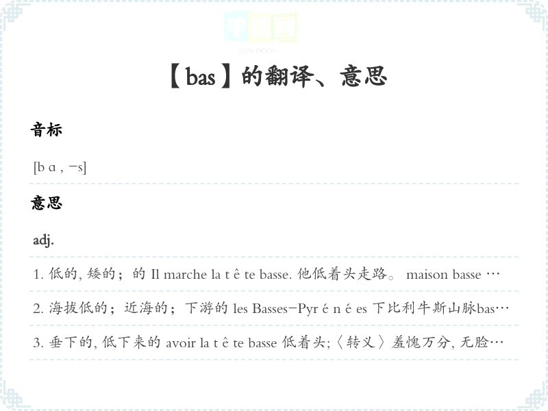 下面的, 下部的, 下方的bas étage 下面的les branches basses d'un arbre树的下部树枝soleil bas 夕阳Les nuages sont bas. 云低。Le temps [Le ciel] est bas. 天低云暗。ce [le] bas monde 人间, 尘世n.m.下部, 下端, 底部, 末端le bas du visage 脸的下部le bas d'une montagne 山脚, 山麓recoudre le bas du pantalon 重新缝裤脚的边le bas d'une gamme de produits [un produit bas de gamme](个系列中的)低档次产品des hauts et des bas 起伏bas de casse【印刷】字盘底部;小写字母铅字n.m.