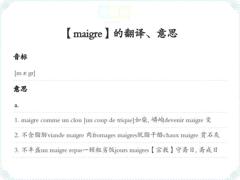 【maigre】 联想:、 近义词:、 反义词: 联想词