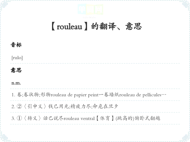 卷;卷状物;形物rouleau de papier peint一卷墙纸rouleau de pellicules photographiques胶卷donner un rouleau à développer交一卷胶片rouleau de printemps春卷être au bout de son rouleau