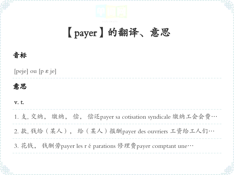 花钱, 钱酬劳payer les réparations 修理费payer comptant une marchandise 现钞一件商品travail bien (mal) payé 报酬高(低)工作Combien avez-vous payé votre vélo? 你这辆自行车花了多少钱?Mon père m'a payé un stylo. [转]我父亲替我了一支钢笔。 Viens, je te paie un verre. [转], 我请你喝一杯。 un succès qu'on paie cher [转]出很大代价获得成功。 Il me le paiera. [转]这笔帐我会跟他算。