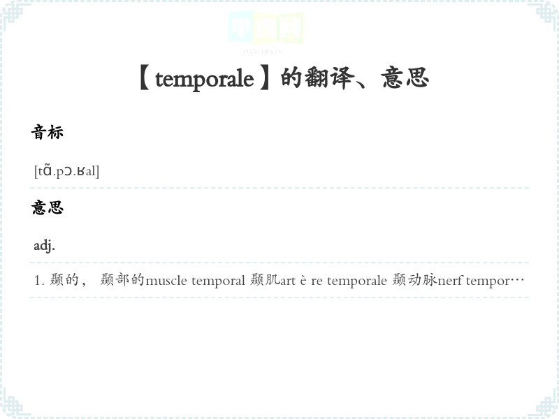 【temporale】 助记:、 词根:、 联想、 名词化:、 词化:、 形容词化:、 近义词、 反义词、 同音、近音词 联想词