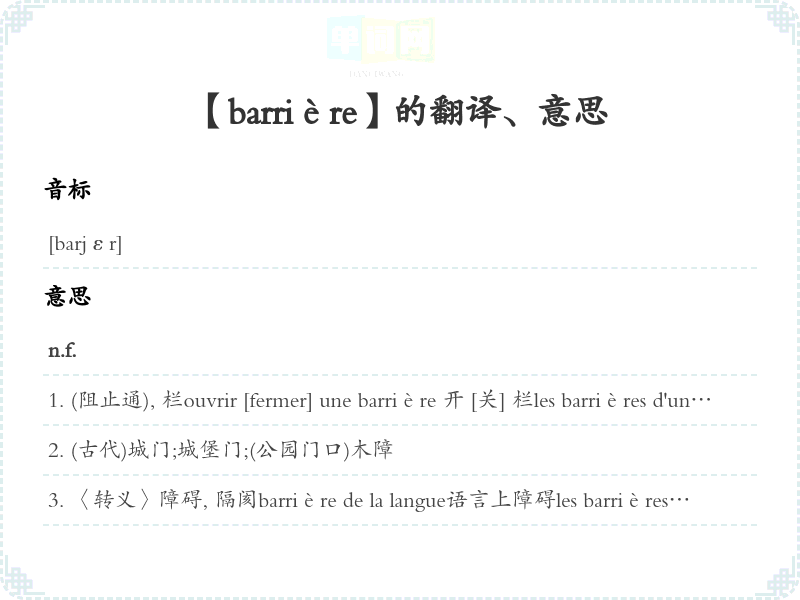 (阻止通), 栏ouvrir [fermer] une barrière 开 [关] 栏les barrières d'un passage à niveau【铁路】平交道口栏木barrière de dégel融冰禁栏 [禁止重型卡车进入融冰区公路标志]barrière naturelle〈引申义〉天堑, 天险, 天然屏障barrière de potentiel【物理学】势垒, 位垒barrière de confinement【核】密封屏barrière de diffusion【核】扩散屏