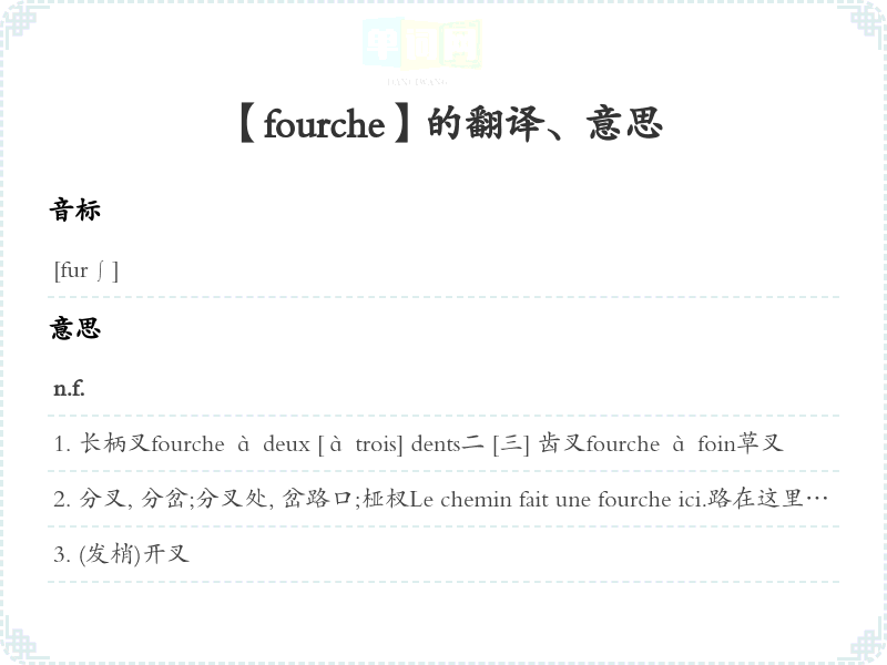 分叉, 分岔;分叉处, 岔路口;桠杈Le chemin fait une fourche ici.路在这里分岔。la fourche d'un pantalon裤裆