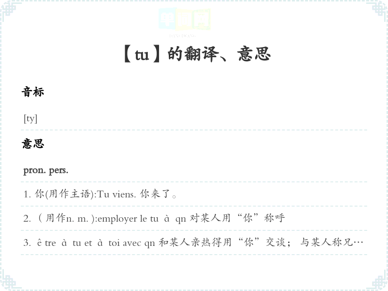 (用作n. m. ):employer le tu à qn 对某人用“你”称呼